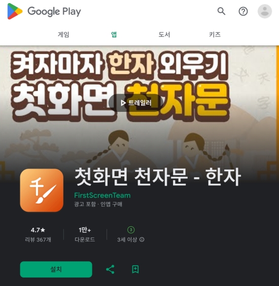 1. '첫화면 천자문'은 스마트폰에 설치하여 한자 공부를 돕는 애플리케이션입니다. 사용자들로부터 4.7점의 높은 평점을 받고 있으며, 1만 회 이상 다운로드되어 많은 사람이 이용하고 있음을 알 수 있습니다. 3세 이상이면 누구나 사용할 수 있도록 만들어져 온 가족이 함께 한자를 익히는 데 활용하기 좋습니다.