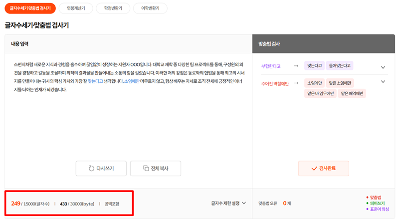 6. 수정이 완료되면, 틀린 맞춤법 개수가 '0개'로 바뀐 것을 확인할 수 있습니다. 동시에 왼쪽 아래에서는 수정된 글의 전체 글자 수를 바로 알 수 있어, 글자 수 제한이 있는 서류를 작성할 때도 매우 유용합니다.