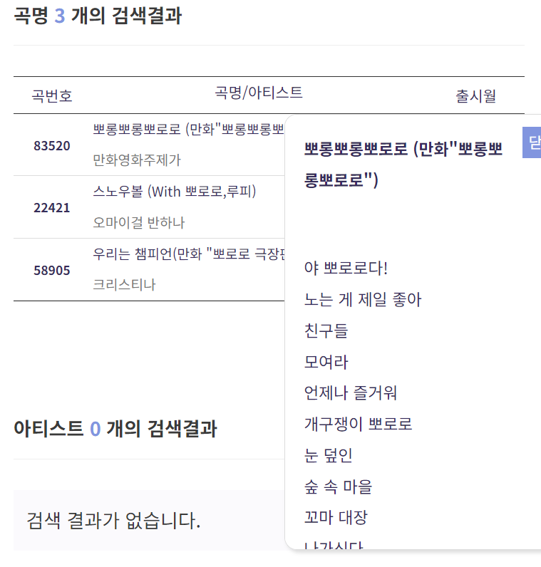 2. 검색을 마치면 화면에 결과 목록이 나타납니다. 여기서 가장 왼쪽에 있는 '곡번호' 항목을 확인하면, 노래방 기계에 입력해야 할 숫자를 바로 알 수 있습니다. 이 번호만 기억해두면 노래방에서 책을 찾을 필요가 없습니다.