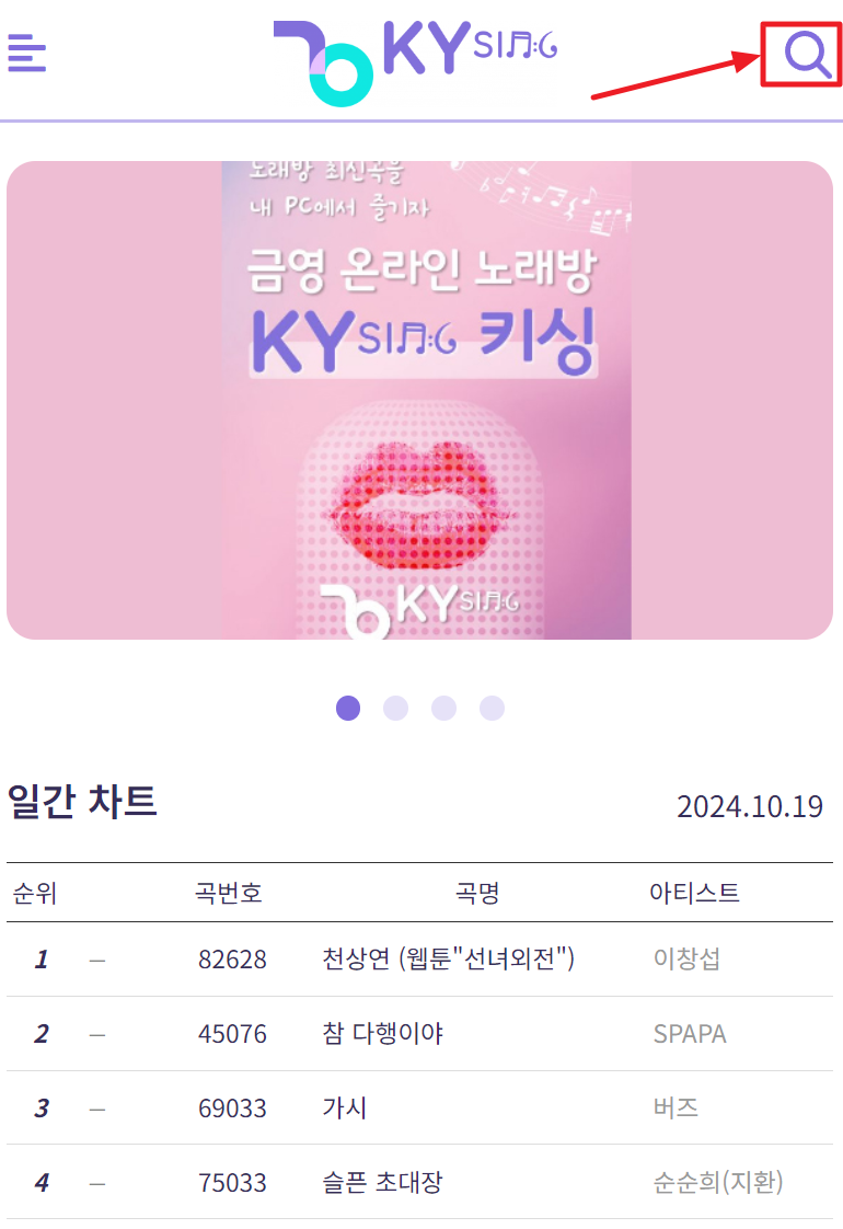 3. 스마트폰으로 홈페이지에 접속했을 때는 화면 오른쪽 위에 있는 돋보기 모양의 아이콘을 눌러주세요. 그러면 노래를 찾을 수 있는 별도의 검색 화면으로 이동하게 됩니다. 모바일 환경에서도 쉽게 이용할 수 있도록 구성되어 있습니다.