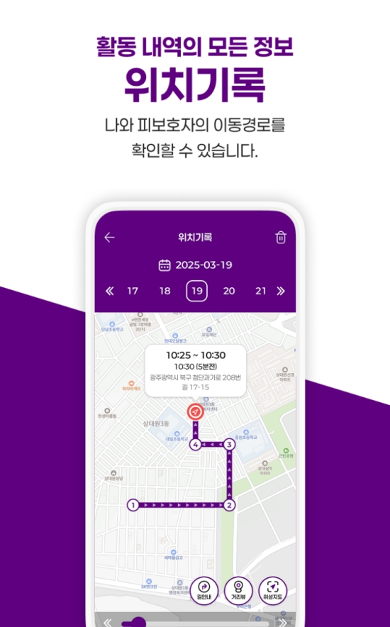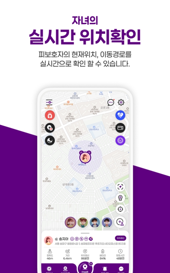 4. 보호 대상자의 현재 위치는 물론, 어떤 경로로 이동했는지까지 실시간으로 확인할 수 있습니다. 아이콘을 통해 여러 명의 위치를 동시에 파악할 수 있고, 정확한 주소와 배터리 잔량 같은 세부 정보까지 알려주어 더욱 안심할 수 있습니다.
