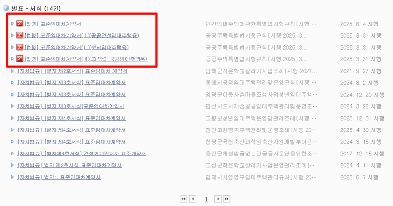 3. 다양한 종류의 표준임대차계약서 목록이 나타납니다. 이 중에서 현재 상황에 맞는, 예를 들어 민간임대주택에 관한 법률 시행규칙에 따른 서식 등 필요한 항목을 찾아서 선택해 주세요.