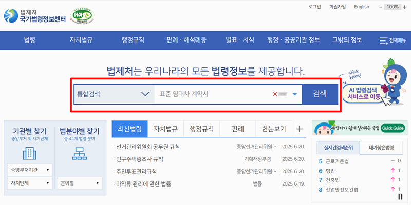 1. 홈페이지 중앙에 위치한 통합검색 창에 '표준 임대차 계약서'라고 입력한 뒤 옆에 있는 검색 영역을 눌러주세요. 이곳에서 법령, 판례 등 다양한 법률 정보를 한 번에 찾아볼 수 있습니다.