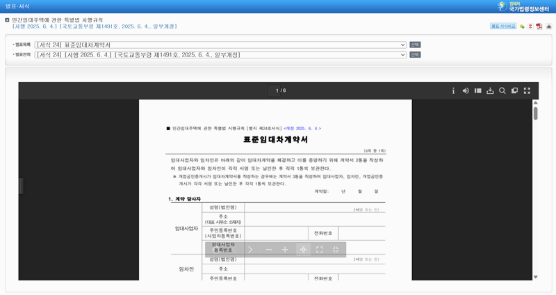7. 만약 최신 버전이 아닌 이전 시행일의 서식이 필요하다면 '별표연혁' 부분을 확인해 보세요. 여기서 과거에 시행되었던 여러 버전의 계약서 목록을 보고 필요한 시점의 문서를 선택하여 받을 수도 있습니다.