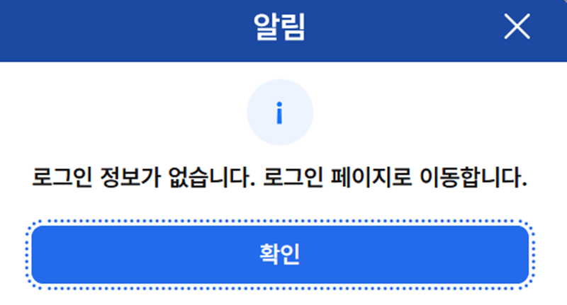 3. 개인의 정보가 필요한 서비스이므로, 조회를 위해서는 로그인이 필요하다는 안내창이 나타납니다. 안전한 이용을 위해 본인임을 확인하는 절차를 거쳐야만 다음 화면으로 넘어갈 수 있으니, '확인'을 눌러 로그인 화면으로 이동해 주세요.