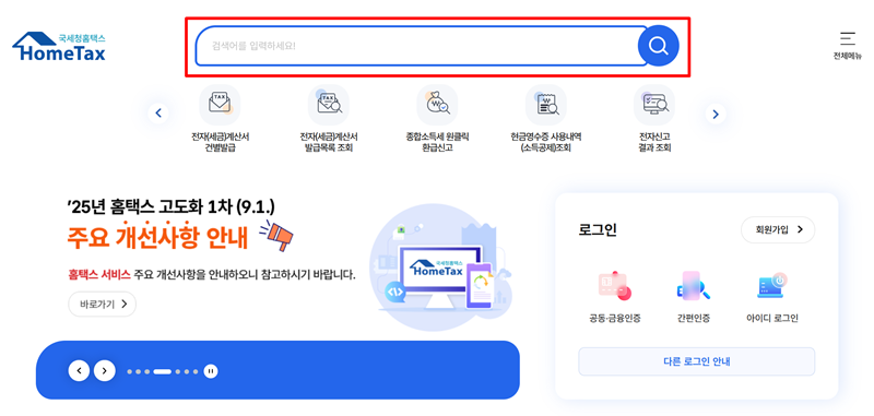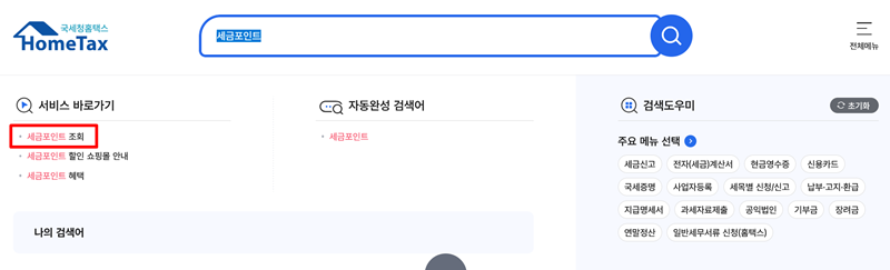 1. 국세청 홈택스 홈페이지의 상단 중앙에 위치한 검색창을 통해 원하는 정보를 손쉽게 찾아볼 수 있습니다. 이곳에 '세금포인트'라고 입력한 뒤 돋보기 모양을 눌러주면 관련 서비스로 바로 이동하는 것이 가능합니다.