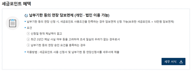 6. 쌓인 포인트로는 여러 가지 혜택을 누릴 수 있는데, 그중 하나는 납부기한을 연장해야 할 때 담보를 면제받는 것입니다. 신청일 현재 체납액이 없고, 최근 2년간 체납 사실이 없는 등 몇 가지 요건을 충족하면 이 혜택을 이용할 수 있습니다.