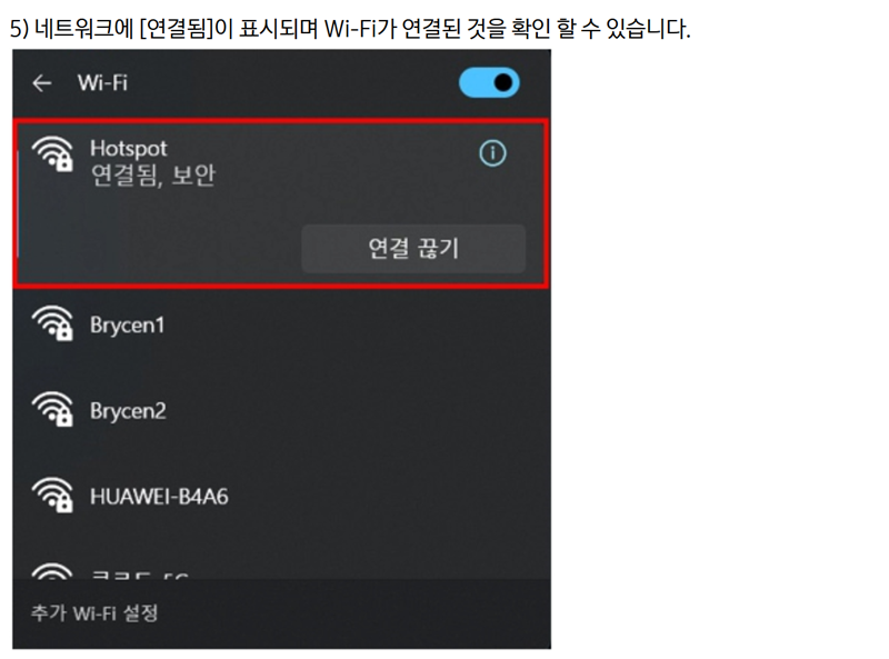 7. 마찬가지로 주변의 사용 가능한 무선랜 목록이 나타납니다. 이 목록을 잘 살펴보고 내가 접속하고자 하는 네트워크를 고른 뒤 '연결'을 눌러 과정을 계속 진행하면 됩니다.