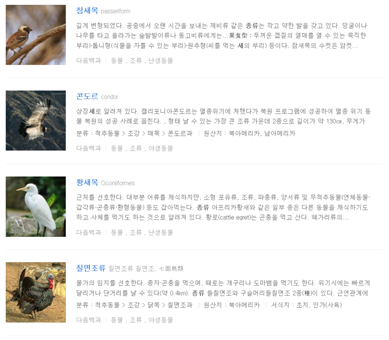 2. 검색을 마치면 참새목, 콘도르, 황새목, 칠면조목 등 다양한 분류에 속한 새들의 목록이 나타납니다. 익숙한 이름부터 생소한 이름까지 여러 종류의 새를 한눈에 살펴볼 수 있어, 조류의 다양성을 직관적으로 파악하는 데 도움이 됩니다. 이 목록에서 호기심이 생기는 새를 골라 탐색을 이어갈 수 있습니다.