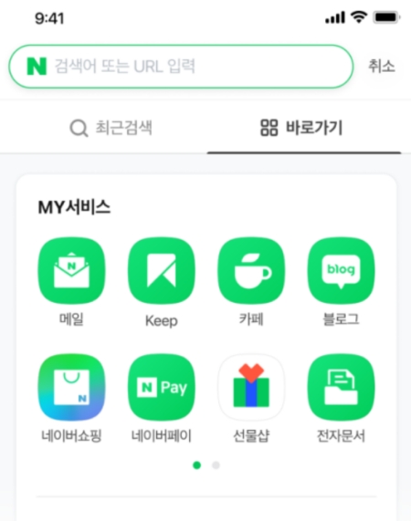 5. 최근 검색어 옆에 있는 '바로가기' 항목을 선택하면 나만의 서비스 허브를 만날 수 있어요. 자주 사용하는 메일, 블로그, 네이버페이, 쇼핑 같은 서비스들을 이곳에 모아두면, 여러 단계를 거치지 않고 터치 한 번으로 빠르게 이동할 수 있어 아주 편리합니다.