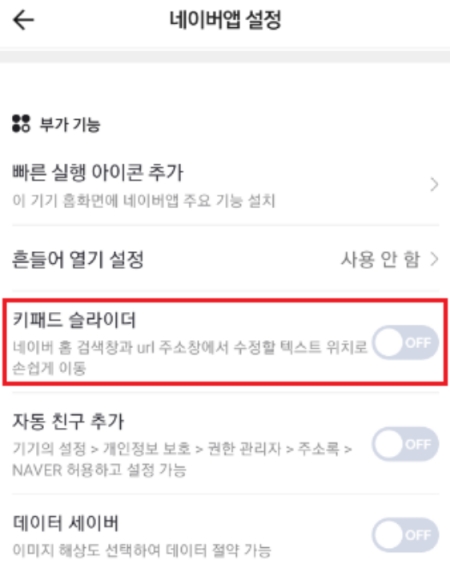 7. 이 편리한 키패드 슬라이더 기능은 네이버앱 설정에서 켜고 끌 수 있어요. 혹시라도 이 기능이 보이지 않는다면 설정 메뉴의 '부가 기능' 항목으로 들어가 '키패드 슬라이더'가 활성화되어 있는지 확인해 보세요. 나에게 맞게 설정을 변경할 수 있답니다.
