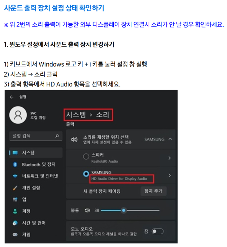 3. 외부 디스플레이를 연결했는데도 소리가 안 난다면 윈도우 설정에서 사운드 출력 장치가 올바르게 되어 있는지 살펴봐야 해요. 키보드의 윈도우 로고 키와 'I' 키를 함께 눌러 설정 창을 연 뒤, '시스템' 항목의 '소리'로 들어가세요. 여기서 출력 장치가 현재 연결된 모니터(HD Audio)로 지정되어 있는지 확인합니다.