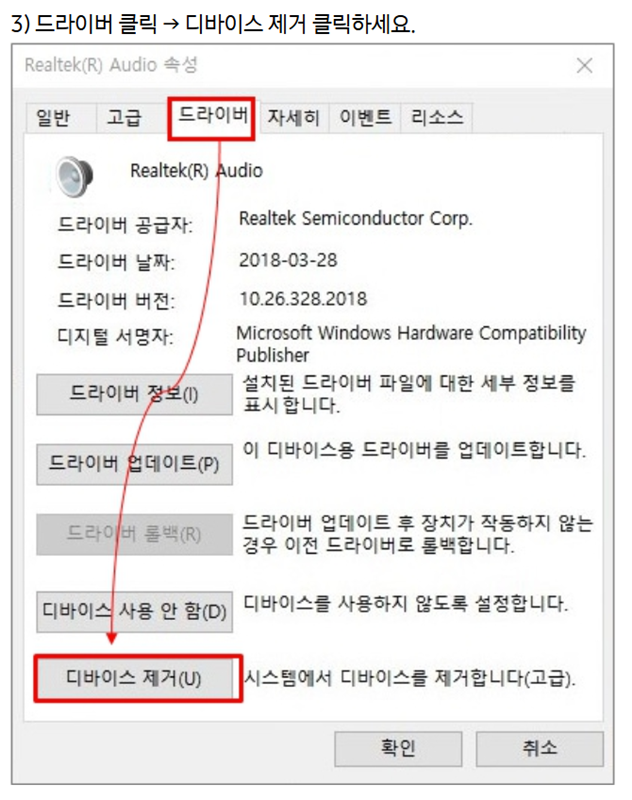 8. 장치 속성 창이 나타나면 여러 탭 중에서 '드라이버' 탭으로 이동하세요. 이곳에서 현재 설치된 드라이버의 정보를 확인할 수 있으며, 아래쪽에 있는 여러 항목 중에서 '디바이스 제거'를 선택하여 삭제를 진행할 수 있습니다.