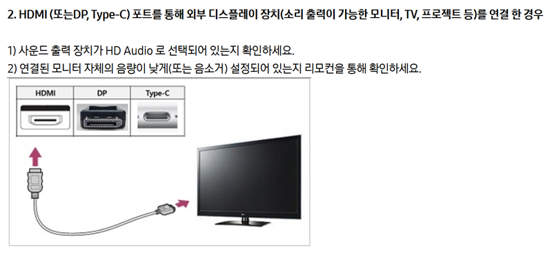 2. HDMI나 DP, Type-C 같은 포트를 사용해 모니터나 TV에 연결한 경우에도 소리가 나지 않을 수 있어요. 이 케이블들은 소리 신호도 함께 전달하기 때문입니다. 먼저 모니터나 TV 자체의 소리가 음소거로 되어 있거나 너무 낮게 설정되어 있지는 않은지 리모컨 등을 통해 확인해 보세요.