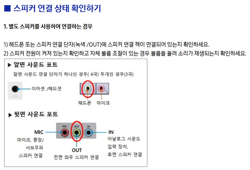 1. 가장 먼저 스피커가 컴퓨터에 제대로 연결되어 있는지 확인해 보세요. 헤드셋이나 스피커 연결선은 본체 뒷면이나 앞면의 녹색(OUT) 단자에 꽂혀 있어야 합니다. 스피커 자체의 전원이 켜져 있는지도 살펴보고, 볼륨 조절기가 있다면 소리를 키워서 재생되는지 들어보는 것이 좋습니다.