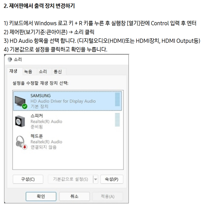 4. 제어판을 통해서도 출력 장치를 바꿀 수 있습니다. 윈도우 로고 키와 'R' 키를 눌러 실행창을 열고 'Control'을 입력하세요. 제어판이 나타나면 '소리' 항목으로 들어갑니다. 여러 장치 목록 중에서 HDMI로 연결된 오디오 장치를 기본값으로 설정하면 모니터에서 소리가 나게 할 수 있습니다.