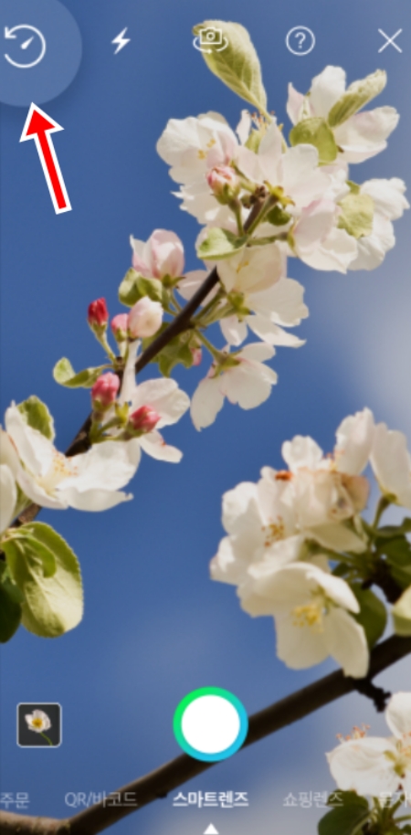 3. 카메라가 활성화되면 화면에 보이는 풍경이 나타납니다. 이제 이름을 알고 싶은 꽃이나 식물이 화면에 잘 보이도록 가까이 다가가 구도를 잡아주세요. 그리고 화면 하단의 '스마트렌즈'라고 적힌 동그란 촬영 부분을 눌러주세요.