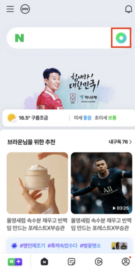 1. 가지고 계신 스마트폰에서 네이버 앱을 열어주세요. 첫 화면의 검색창을 보면 오른쪽에 동그란 녹색 아이콘이 보일 거예요. 궁금한 대상을 찾아주는 검색의 시작점이니, 이 아이콘을 가볍게 눌러주세요.