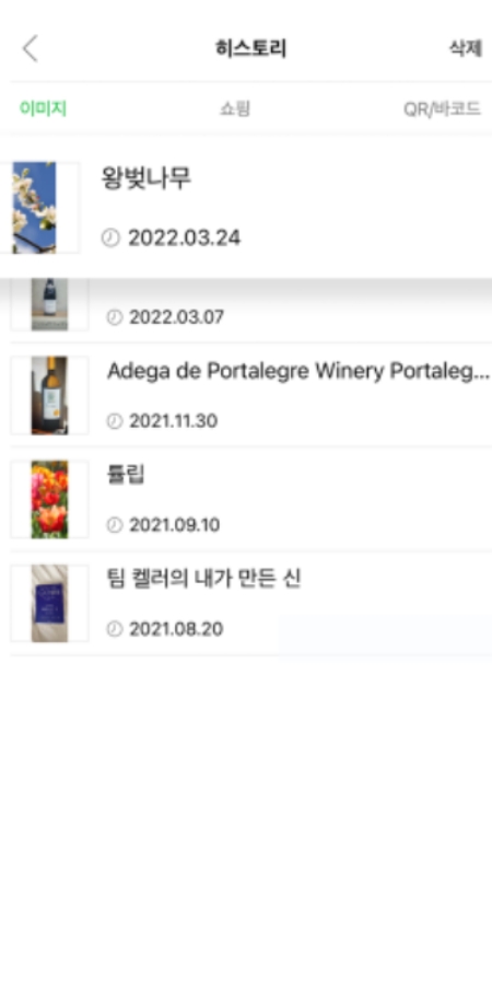 6. 이 아이콘을 누르면 내가 스마트렌즈로 검색했던 모든 기록이 목록으로 나타납니다. 이미지, 쇼핑, QR/바코드 등 종류별로 나누어 볼 수 있으며, 언제 무엇을 찾아봤는지 날짜까지 정확하게 확인할 수 있어 편리합니다.