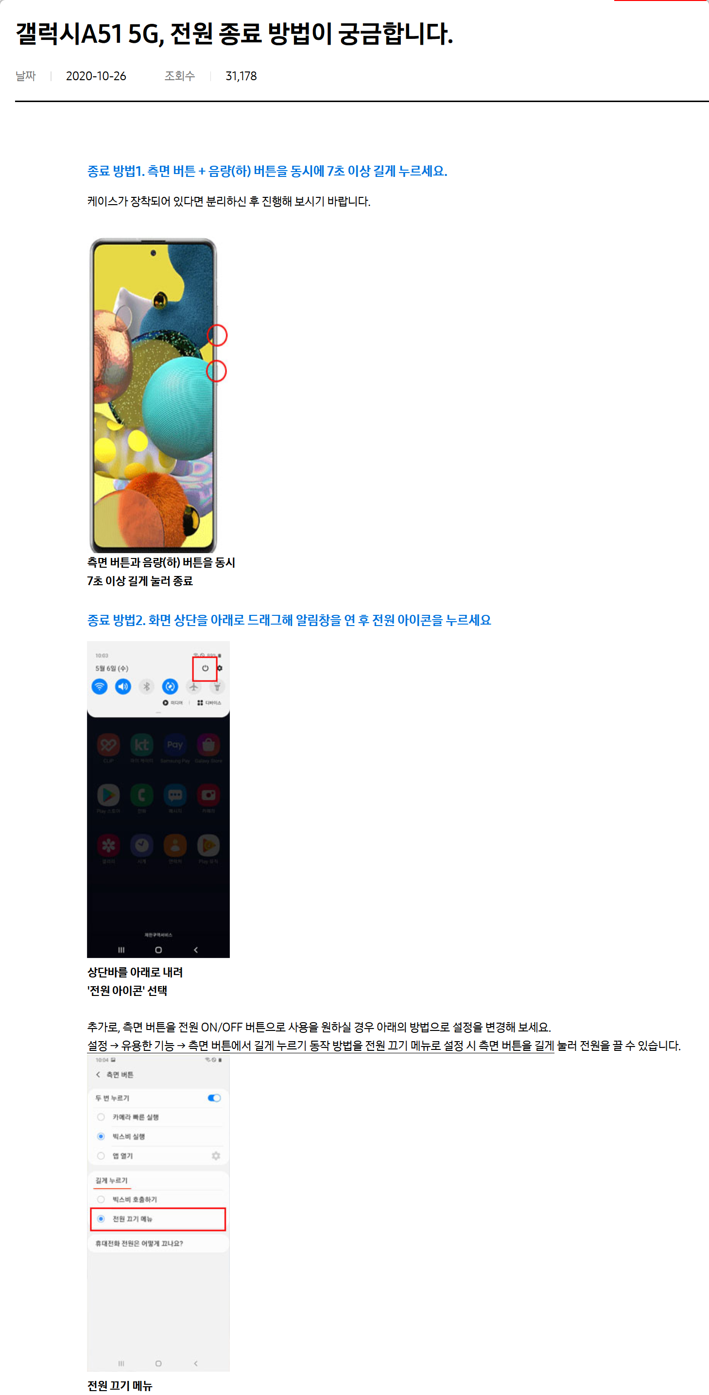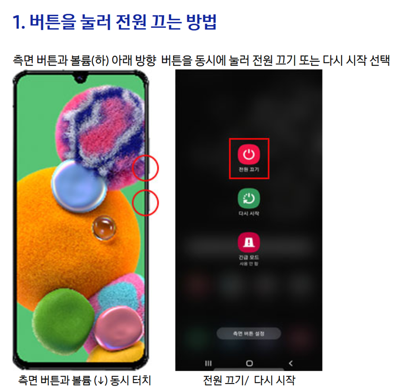 5. 특정 기종(예: 갤럭시 A51 5G)의 전원 종료 방법도 동일하게 적용됩니다. 화면이 멈췄을 경우 측면 버튼과 음량(하) 버튼을 7초 이상 길게 눌러 강제 재시작할 수 있으며, 평상시에는 화면 상단을 아래로 내려 알림창을 연 뒤 전원 아이콘을 눌러 종료할 수 있습니다. 또한, 설정 변경을 통해 측면 버튼을 길게 눌러 전원을 끄는 방식으로 바꾸는 것도 가능합니다.