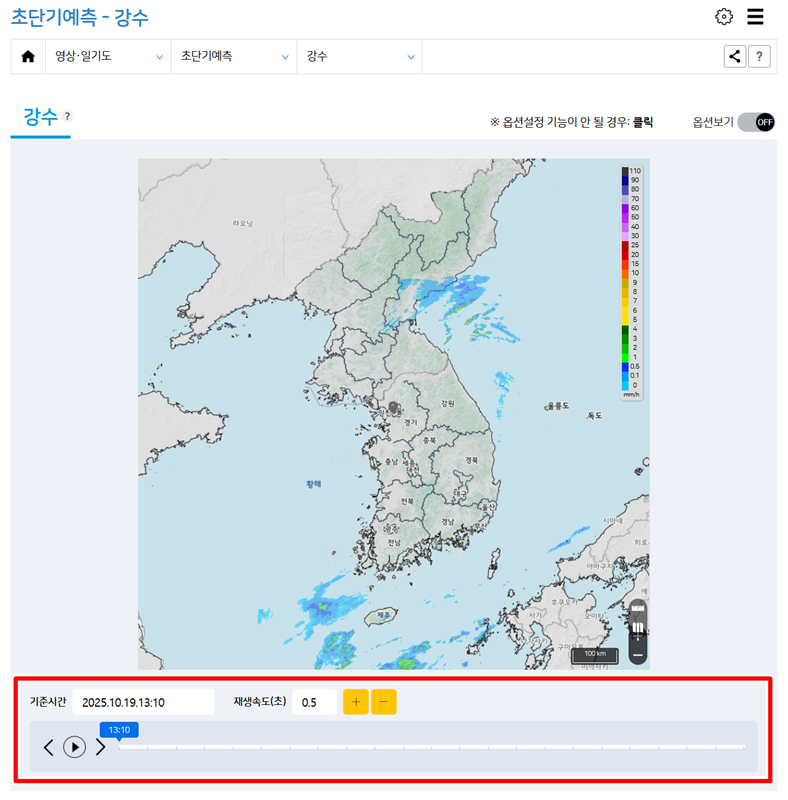 3. 초단기예측 - 강수 화면에서는 한반도 지도 위에 현재와 미래의 강수 분포가 색깔로 표시됩니다. 화면 아래쪽에는 시간 막대가 있어서, 재생 표시를 누르거나 막대를 직접 움직여서 비구름이 시간대별로 어떻게 이동하는지 영상처럼 확인할 수 있습니다.