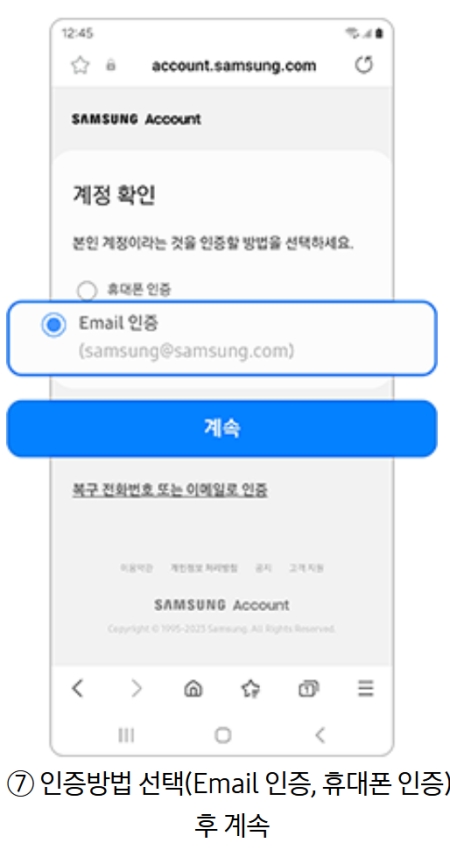 7. 계정 확인을 위한 인증 방법을 선택해야 합니다. 가입 정보에 따라 휴대폰 문자나 이메일 중 가능한 인증 방식을 고른 후 '계속'을 진행합니다.