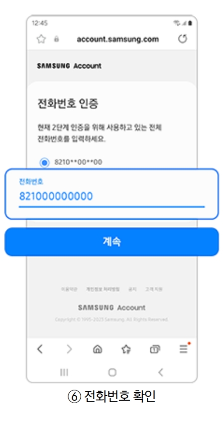 6. 보안을 위해 2단계 인증에 사용하고 있는 전체 전화번호를 입력하여 본인임을 확인하는 절차를 거칩니다. 화면에 보이는 일부 번호를 참고하여 정확하게 입력하고 '계속'을 눌러주세요.