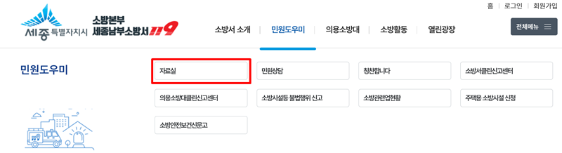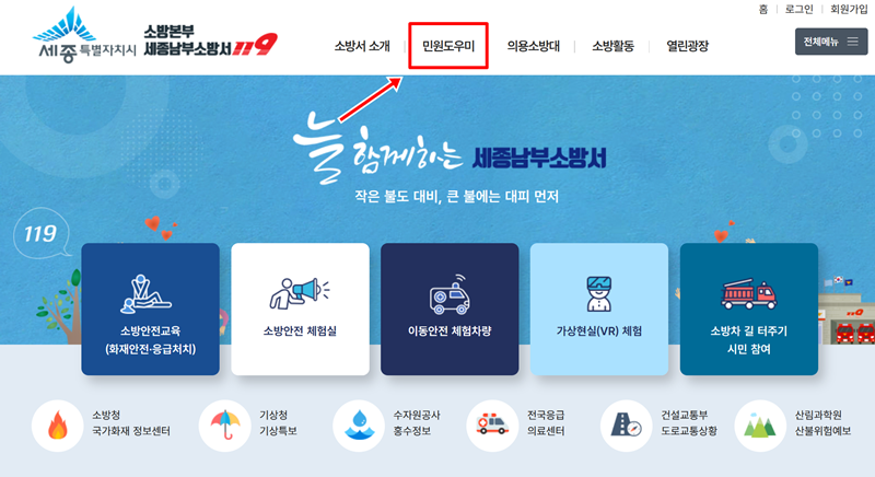 1. 세종소방본부 홈페이지 상단 메뉴를 살펴보면 '소방서 소개', '민원도우미', '의용소방대' 등 여러 항목이 있습니다. 여기서 우리는 민원 관련 서식을 찾아야 하므로 '민원도우미'를 선택하여 다음 페이지로 이동합니다.
