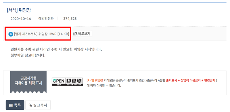 5. 게시글의 상세 내용으로 들어오면 첨부파일 목록에서 '[별지 제3호서식] 위임장.HWP' 파일을 확인할 수 있습니다. 이 파일을 선택하면 바로 PC로 내려받기가 시작되며, 한컴오피스(한글) 프로그램이 있다면 바로 열어볼 수 있습니다.