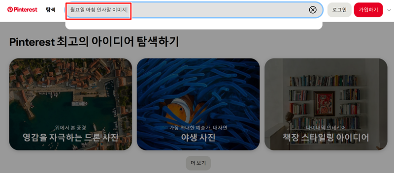 2. 탐색 페이지로 이동하면 상단에 검색창이 활성화됩니다. 이 검색창에 '월요일 아침 인사말 이미지'와 같이 찾고 싶은 주제를 명확하게 입력하면 관련된 결과들을 빠르고 정확하게 찾아볼 수 있습니다.