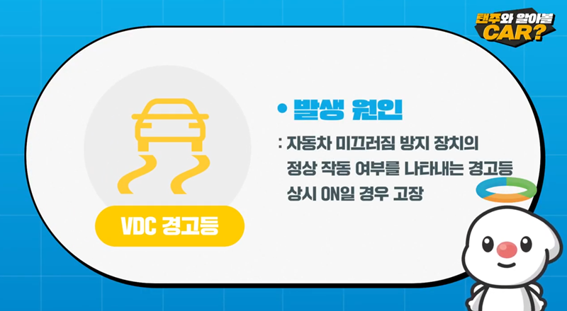 5. VDC 경고등은 자동차가 미끄러지는 것을 방지하는 장치의 정상 작동 여부를 나타냅니다. 평소에는 꺼져 있다가 기능이 작동할 때 깜빡이며, 계속 켜져 있다면 장치에 고장이 발생한 것입니다. TPMS 경고등은 타이어 공기압 센서의 불량, 타이어 공기압 부족, 혹은 타이어에 펑크가 났을 때 켜집니다. 안전한 곳에 정차하여 타이어 상태를 확인하고 적정 공기압을 맞춰야 합니다.