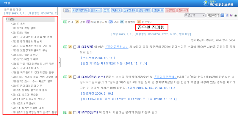 5. '공무원 징계령'을 선택하면 국가법령정보센터로 연결되어 법령의 전문을 볼 수 있습니다. 왼쪽 목차를 통해 징계의 정의, 위원회 설치와 구성, 징계의결 절차 등 제도 운영에 필요한 구체적인 사항들을 각 조항별로 상세하게 확인할 수 있습니다.