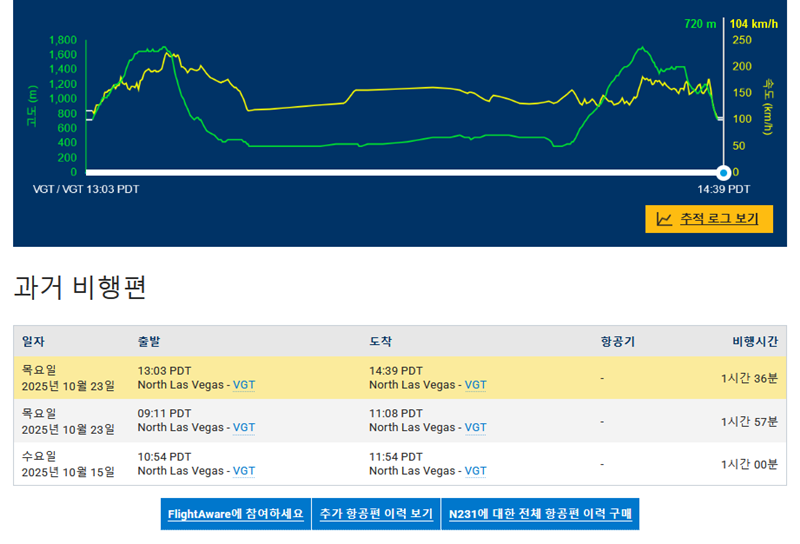 7. 플라이트어웨어는 고도와 속도의 변화를 그래프로 보여주기도 하며, 해당 항공기의 과거 비행 이력까지 조회할 수 있는 강력한 기능을 제공합니다. 이를 통해 특정 항공기의 과거 운항 기록을 날짜별로 상세히 살펴볼 수 있습니다.