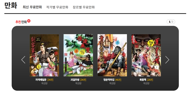 2. 만화 페이지로 이동하면 '최신 무료만화', '작가별 무료만화', '장르별 무료만화' 세 가지 분류가 나타납니다. 어떤 만화가 새로 올라왔는지 확인하거나, 좋아하는 작가의 다른 작품을 찾아보거나, 특정 장르를 골라보는 등 원하는 방식대로 탐색할 수 있습니다.
