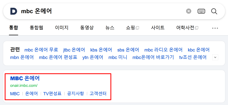 4. 이번에는 다른 방송사를 이용하는 경우를 살펴보겠습니다. 검색을 통해 'mbc 온에어'를 찾아 해당 홈페이지로 들어갑니다. 다양한 방송 정보를 확인할 수 있는 첫 화면이 나타납니다.