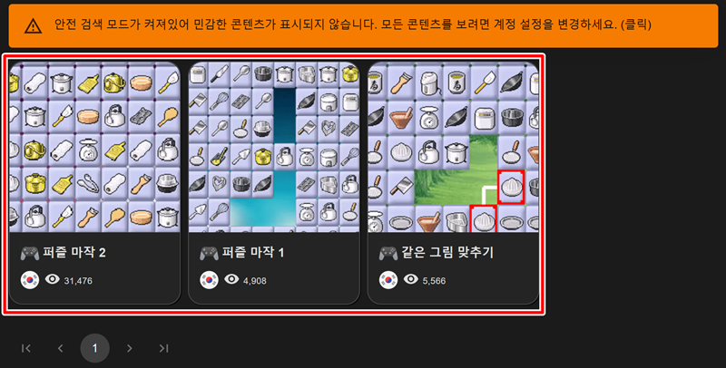 2. 검색 결과 화면에는 여러 가지 짝맞추기 게임 목록이 나타납니다. '퍼즐 마작'이나 '같은 그림 맞추기' 등 마음에 드는 게임을 선택하여 들어갑니다. 각 게임의 미리보기 이미지와 조회수를 참고하여 고를 수 있습니다.