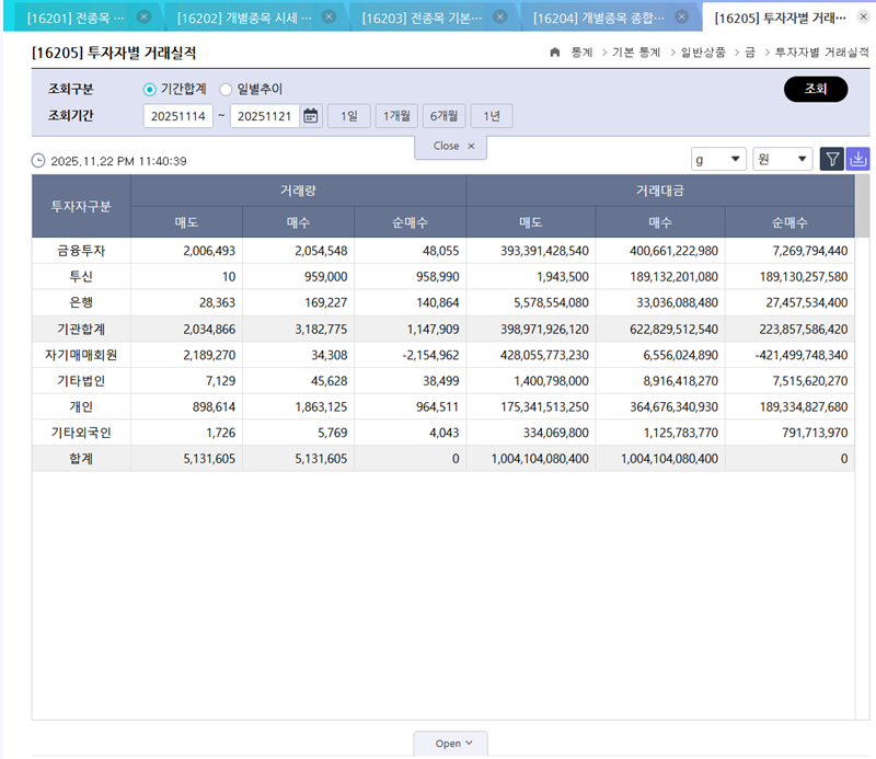 6. 누가 금을 사고팔았는지 궁금하다면 투자자별 거래실적을 살펴보는 것이 도움이 돼요. 금융투자, 은행, 개인 등 각 투자 주체별로 매도와 매수 물량이 얼마나 되는지 집계된 표를 통해 시장 참여자들의 동향을 엿볼 수 있답니다.