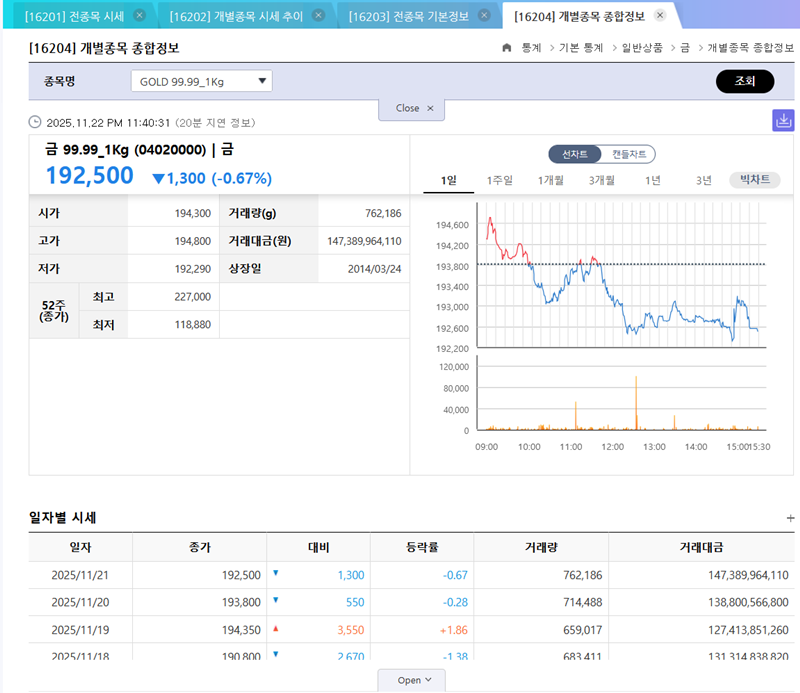 4. 개별 종목 시세 추이 메뉴로 이동하면 날짜별로 금 가격이 어떻게 변해왔는지 흐름을 읽을 수 있어요. 특정 기간을 설정해 조회하면 일자별 종가와 대비 폭, 거래 대금의 변화를 표 형태로 자세히 보여주어 추세를 분석하기 좋아요.
