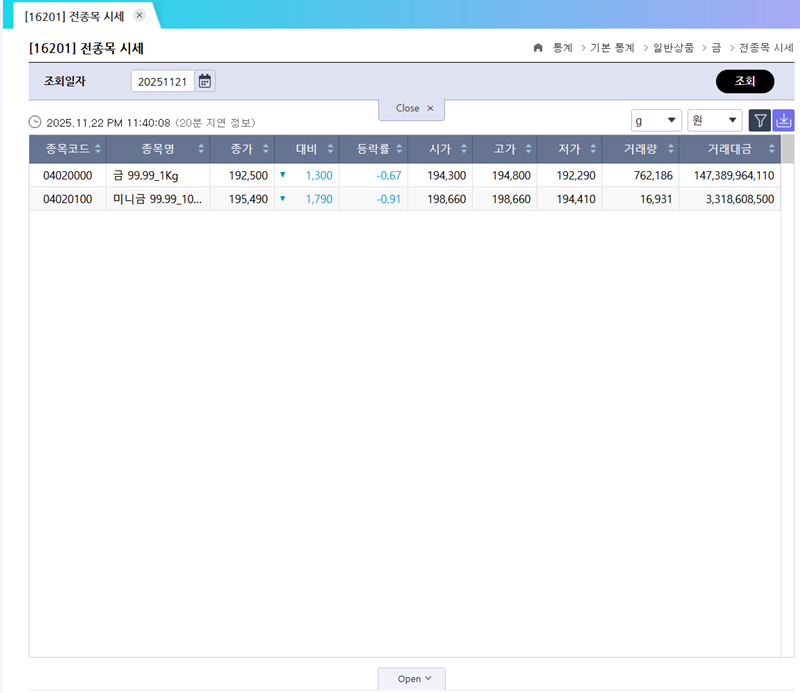 3. 가장 먼저 전종목 시세 화면을 통해 현재 거래되고 있는 금 상품들의 가격을 한눈에 비교할 수 있어요. 1kg 단위의 표준 금과 소액 투자가 가능한 미니 금의 현재가, 등락률, 그리고 당일 거래량까지 실시간으로 파악이 가능하죠.