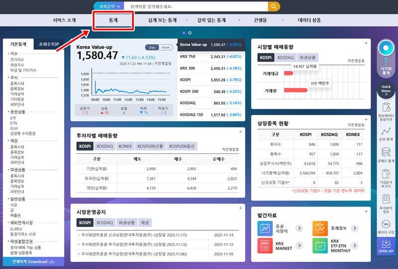1. 메인 화면 상단에 위치한 메뉴 바를 살펴보면 다양한 시장 데이터를 분류해 둔 통계 항목이 보일 거예요. 여기서 기본 통계라는 큰 틀 아래 주식이나 채권 등 여러 자산 정보가 나열되어 있는데, 우리는 일반상품 카테고리에 집중해야 해요.
