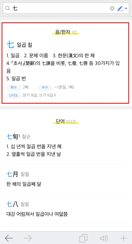 4. 검색창에 단어를 입력하면 그와 관련된 다양한 결과들이 리스트로 쭉 나열됩니다. 저는 예시로 일곱 칠이라는 글자를 찾아보기 위해 검색을 시도해 보았습니다. 화면을 보면 제가 입력한 단어와 일치하는 한자가 가장 위에 표시되는 것을 확인할 수 있습니다. 여기서 내가 찾던 글자가 맞는지 눈으로 확인하고, 해당 항목을 손가락으로 가볍게 눌러 상세 정보를 확인할 준비를 합니다.