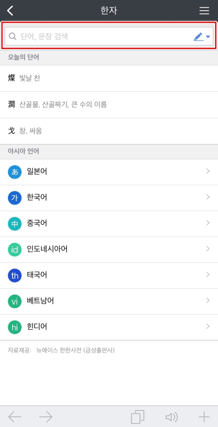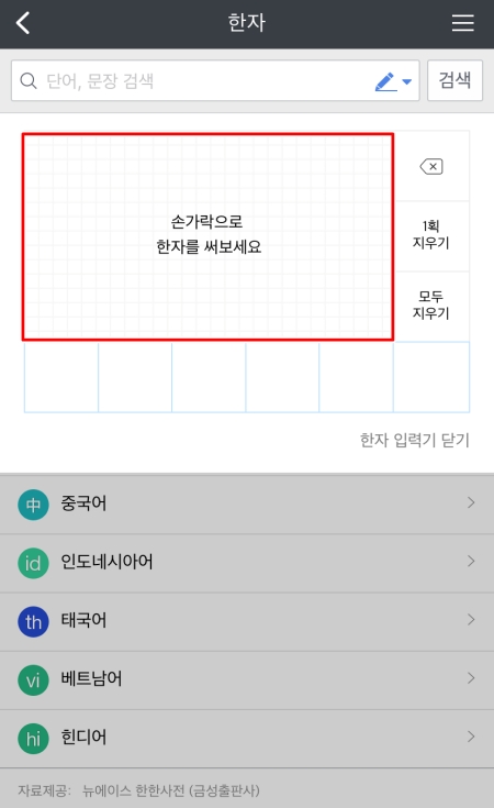 6. 그런데 살다 보면 음을 전혀 모르는 생소한 글자를 만날 때가 더 많습니다. 이럴 때는 검색창에 한글을 입력할 수가 없으니 난감할 수 있는데, 걱정할 필요가 없습니다. 검색창 오른쪽 끝부분을 자세히 보면 연필 모양의 작은 아이콘이 보일 것입니다. 이 아이콘은 내가 직접 손으로 글씨를 써서 찾을 수 있게 해주는 필기 인식 기능을 실행하는 곳입니다.