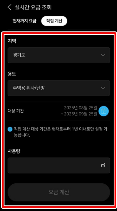 8. '직접 계산'을 선택한 후, 지역, 주택용 여부, 대상 기간, 그리고 가스계량기에 표시된 사용량을 입력하면 예상 요금을 손쉽게 미리 계산해 볼 수 있습니다.