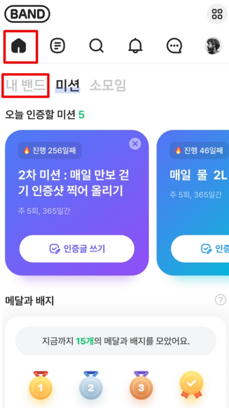 2. 앱 화면 왼쪽 아래에 있는 집 모양의 '홈' 아이콘을 누른 후, 상단에 나타나는 '내 밴드' 항목을 선택하여 내가 가입한 모임 목록으로 이동합니다.