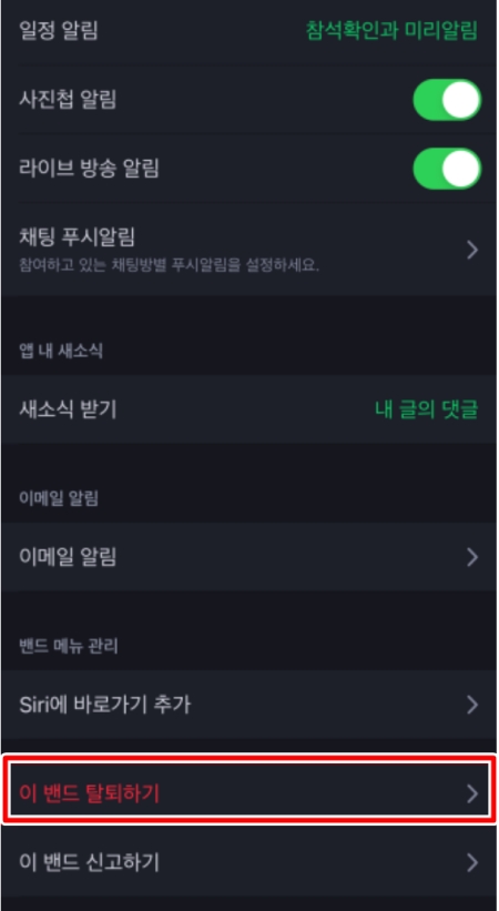 5. 설정 메뉴를 아래로 끝까지 내리면 '이 밴드 탈퇴하기'라는 항목이 있습니다. 이 항목을 선택하면 탈퇴 절차가 시작됩니다.