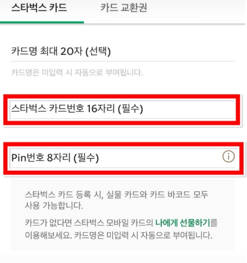 5. 스타벅스 카드번호 16자리와 Pin 번호 8자리를 입력하는 칸이 명확히 표시되어 있으며, 이 과정을 거치면 실물 카드와 카드 바코드를 모두 사용할 수 있게 됩니다.