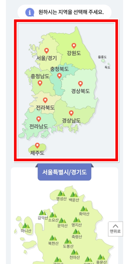 2. 원하는 산을 쉽게 찾아볼 수 있도록 지도 서비스를 갖추고 있습니다. 전국 지도가 나타나면 원하는 지역을 선택해 보세요. 예를 들어 서울특별시/경기도를 고르면 해당 지역에 위치한 명산들의 분포를 한눈에 파악할 수 있습니다.