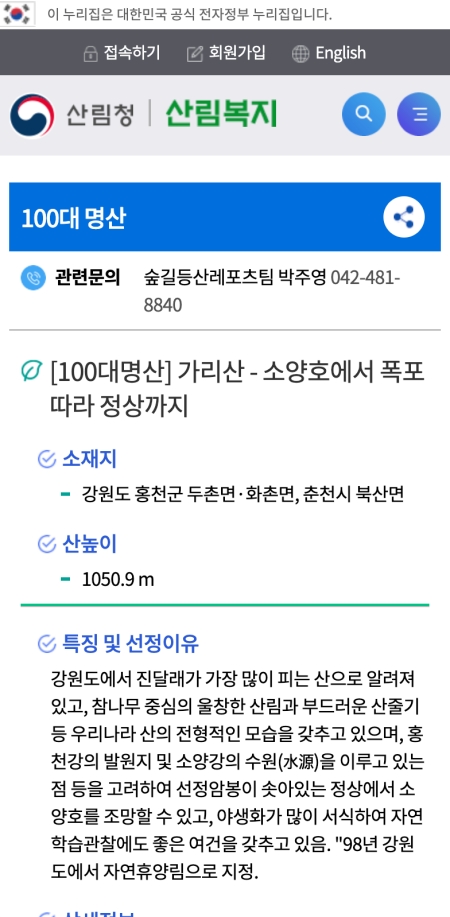 5. 목록에서 특정 산을 고르면 그 산에 대한 상세한 정보를 볼 수 있습니다. 예를 들어 가리산을 선택하면 소재지와 산 높이, 그리고 100대 명산으로 선정된 이유와 특징에 대한 자세한 설명을 확인할 수 있습니다.