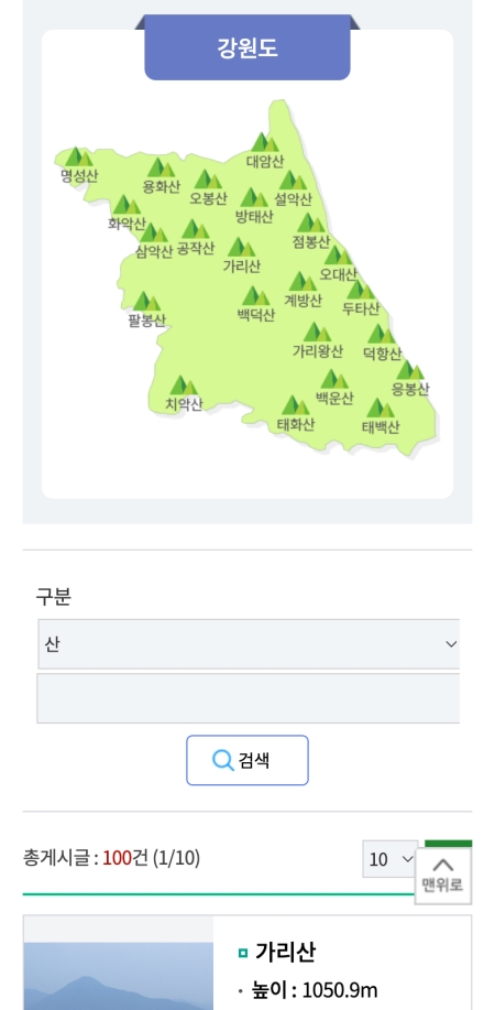 3. 다른 지역도 마찬가지로 확인할 수 있습니다. 지도에서 강원도를 선택하면 설악산, 오대산, 치악산 등 강원도에 있는 100대 명산의 위치를 지도를 통해 직관적으로 볼 수 있어 산행 계획을 세울 때 유용합니다. 직접 산의 이름을 입력하여 검색하는 것도 가능합니다. 검색창 아래에는 전체 100개의 산 목록이 나타나며, 총 몇 개의 게시글이 있는지와 함께 목록을 확인할 수 있어 원하는 산을 빠르게 찾을 수 있습니다.