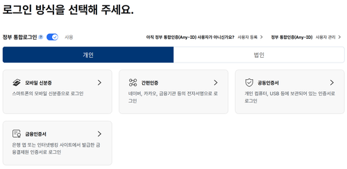 7. 로그인 방식을 선택하는 화면으로 이동합니다. 모바일 신분증, 간편인증, 공동인증서 등 본인이 사용하기 편리한 인증 수단을 선택하여 본인 확인 절차를 완료하면 됩니다.
